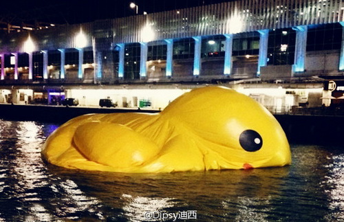 2013年5月14日,香港,由于多處破損,小黃鴨在維多利亞港呆了12天后,因漏氣“躺倒”在維多利亞港。這只高16.5米的充氣黃色橡皮鴨的香港之旅計劃從5月2日延續(xù)到6月9日
