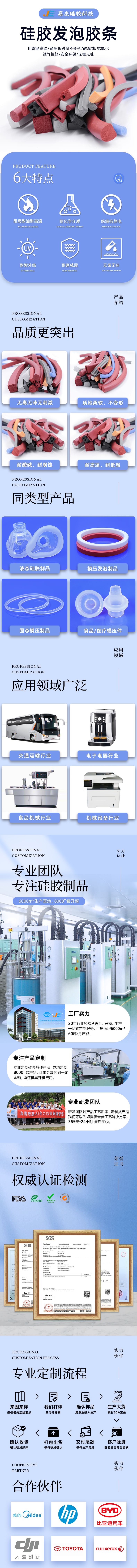 由于異型硅膠發(fā)泡條是硅膠原材料加入發(fā)泡劑制作而成,所以一般也稱為發(fā)泡硅膠條。我廠硅膠海綿條、硅膠海綿帶等產(chǎn)品均是采用100%g氣相硅膠原材料加入發(fā)泡劑經(jīng)過(guò)經(jīng)由高溫烘烤箱硫化,在硫化過(guò)程中產(chǎn)生大量的空氣,致使硅膠內(nèi)部產(chǎn)生大量的小孔而制成,產(chǎn)品最大特點(diǎn)就是耐高溫、彈性好,優(yōu)質(zhì)的耐高溫硅膠海綿條可在300度高溫下持續(xù)工作不變質(zhì)。 深圳嘉杰是廣東深圳地區(qū)專業(yè)的硅膠制品生產(chǎn)制造供應(yīng)廠商,我廠硅膠制品主要包括硅膠管、led硅膠套管、硅膠密封圈條等系列,生產(chǎn)的led鉑金硅膠套管、進(jìn)口硅膠密封條等產(chǎn)品均是大量熱銷產(chǎn)品,有大量現(xiàn)貨庫(kù)存,歡迎詢價(jià)!