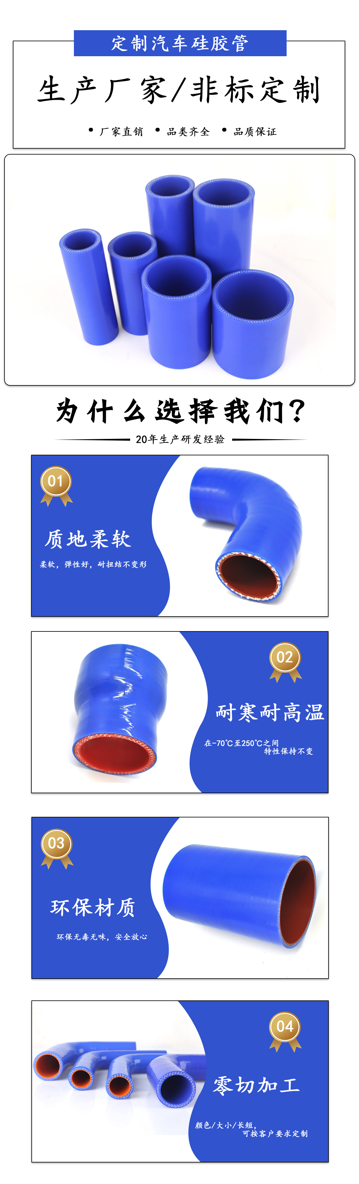 汽車硅膠管: 采用優(yōu)質(zhì)硅膠原料制作,安全無毒無味、顏色、大小、形狀可按要求定制